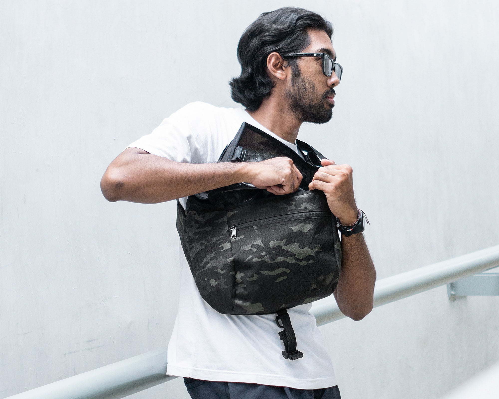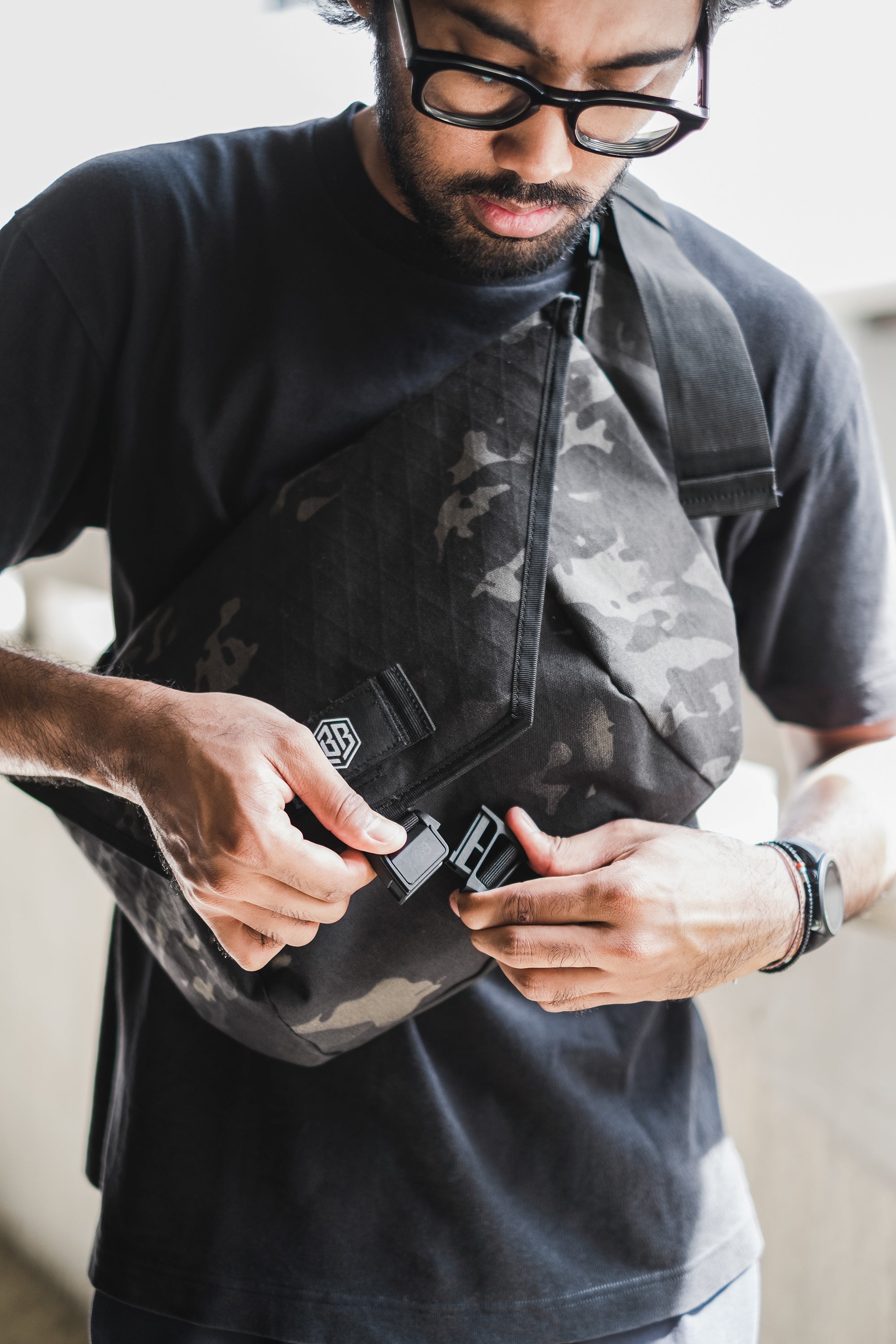 The X50 Multicam® Black version of The Slingshot. The X50 fabric by X-PAC® Comprises 3 laminated layers: a lightweight polyester film-backing inner for low stretch & waterproofing, a post-consumer recycled X‑PLY® mid-layer fiber for bias stability and reinforcement against tear, and an abrasive-resistant 500D DWR coated Cordura® outer. The X50 The Slingshot is waterproof while being 22% lighter than the regular version.